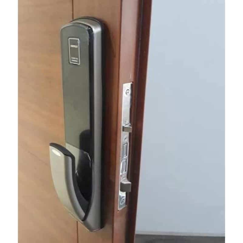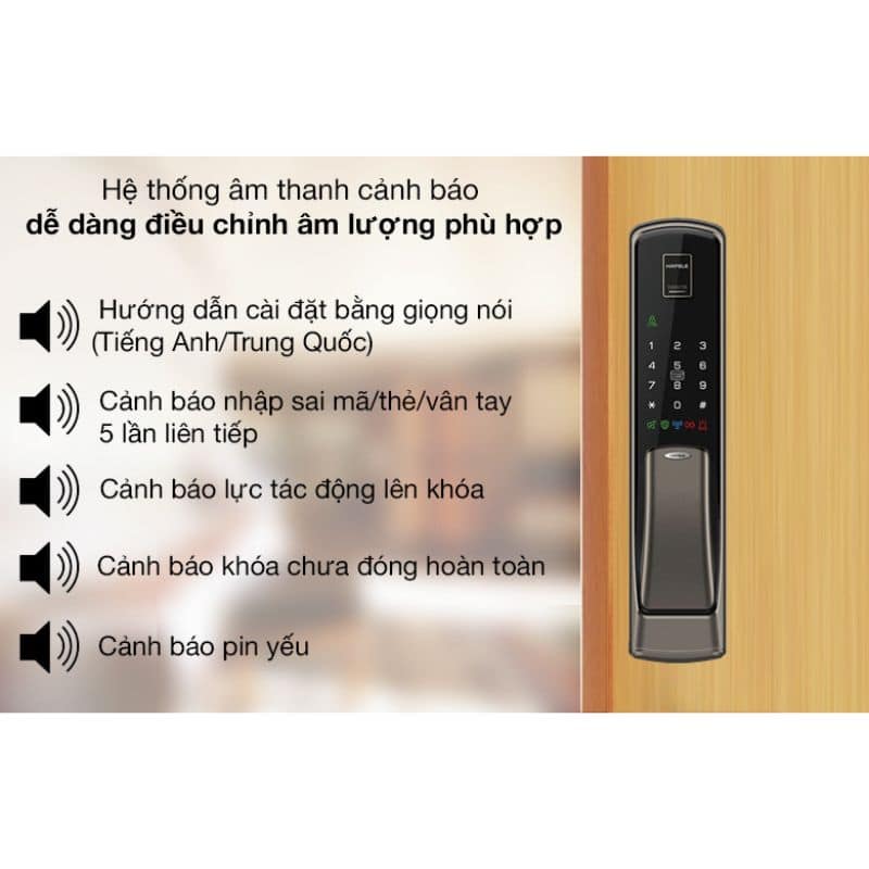 | Chức năng | Quản lý bằng mật khẩu chủ và mật khẩu người dùng với chế độ thường và chế độ bảo mật Có thể thay đổi linh hoạt giữa 2 chế độ khóa tự động và thủ công Chức năng tự động khóa sau khi khóa đã được mở nhưng cửa vẫn đang ở vị trí đóng sau 7s Tích hợp âm thanh cảnh báo khi có lực mạnh tác động lên mặt ngoài của khóa Chức năng cảnh báo khi khóa chưa được đóng hoàn toàn Khóa sẽ phát âm thanh cảnh báo và tự động vô hiệu hóa 3 phút sau khi nhập sai mã/thẻ/ vân tay 5 lần liên tiếp Tích hợp khả năng chống sốc điện Chức năng xáo trộn mật mã nhằm chống sao chép mật mã Tích hợp chức năng khóa kép an toàn từ phía trong nhà Chức năng khóa tay nắm bên trong để ngăn chặn sự đột nhập từ phía ngoài Hướng dẫn sử dụng khóa bằng giọng nói (Tiếng anh/Tiếng Trung) Tay nắm kéo, đẩy tiện lợi và có thể thay đổi theo chiều đóng mở cửa Âm lượng của khóa có thể điều chỉnh linh hoạt với 8 cấp độ Hiển thị 3 mức độ pin và cảnh báo pin yếu |